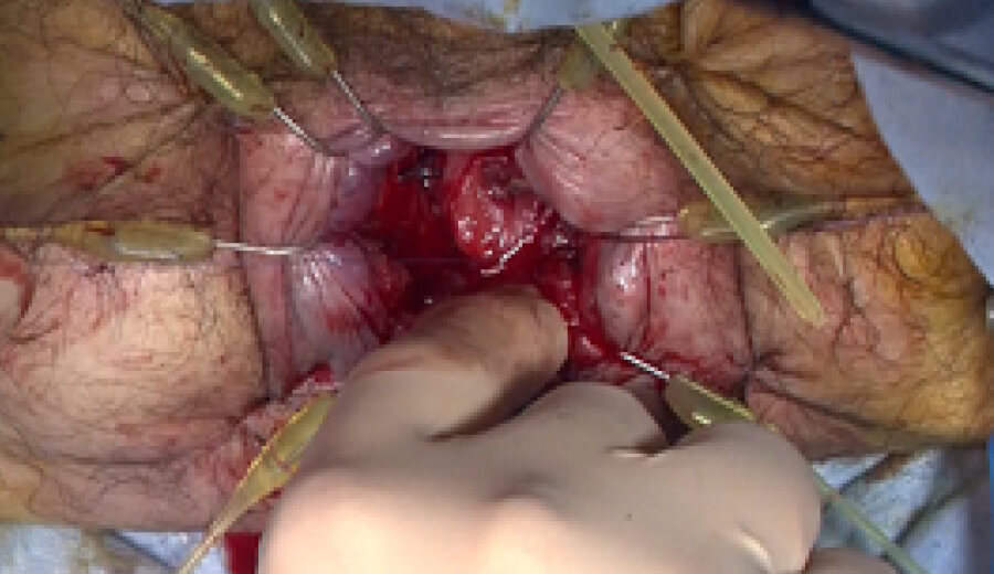 大腸に孔があいて腹膜炎を起こした患者さんでは、大腸(特にS状結腸や直腸)を離断して人工肛門を造設する手術(ハルトマン手術)が行われます。腹膜炎が治まった後に人工肛門を閉鎖して、大腸をつなぎ直す手術(ハルトマンリバーサル)は腹膜炎による癒着などのため難度が高く、大きな開腹手術が必要とされていきました。当科ではそのような症例でも腹腔鏡手術を試みています。最近8年間で11例の経験があり、すべの患者さんで、腹腔鏡下に人工肛門の閉鎖と大腸のつなぎ直しに成功しています。