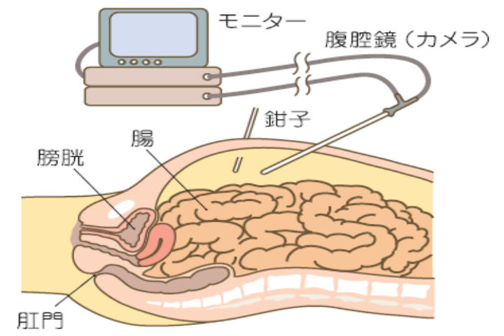 腹腔鏡手術では、お腹の中を炭酸ガス(CO2)で膨らませて(気腹)、手術のためのスペースを確保します。おなかに小さな孔を開けて、そこからカメラや鉗子(メスやはさみのついた棒)を出し入れします。腹腔鏡という小型のカメラで手術の場所をテレビモニターに写し出して、鉗子を用いて手術を行います。